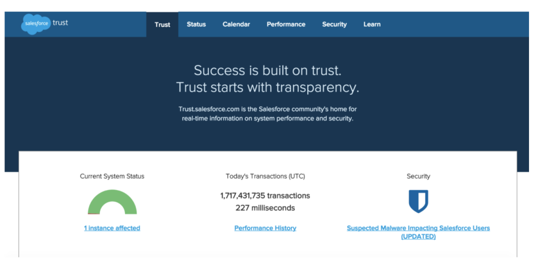 后来,公司通过让客户直观地看到Salesforce服务器的运行状况来获取信任。这当然是个非常大胆的举措,毕竟服务器一切运行的问题都暴露在公众面前,但是为了挽回客户,他们还是选择了完全透明和坦诚。随后还推出了 trust.salesforce.com网站,实时提供升级公告,运维状况,性能预警,接口可用性,并着重说明如何保护客户在云端的资料。