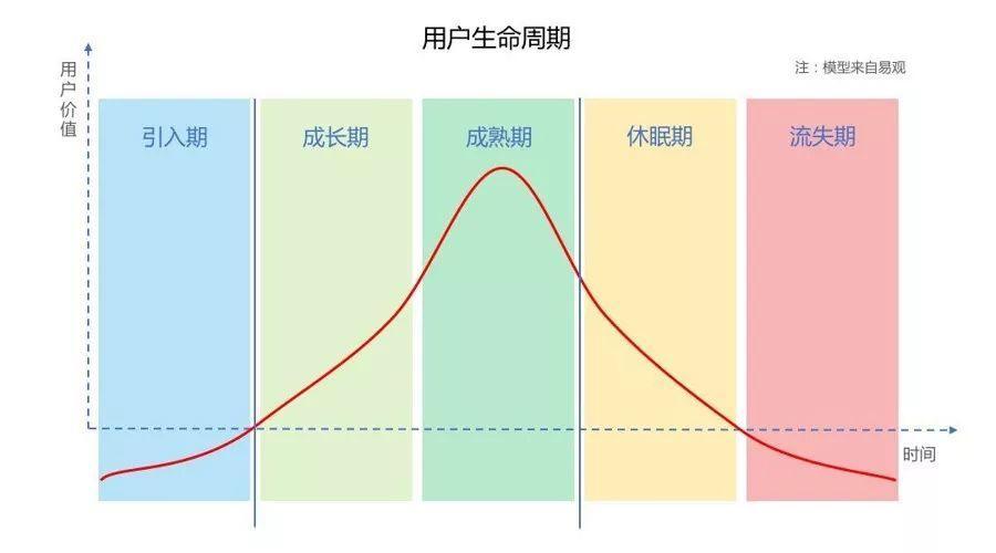 用户生命周期分为:导入期、成长期、成熟期、休眠期、流失期。