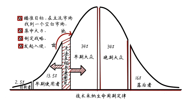 但是早期使用者走向早期大众会有一道难以跨越的鸿沟,只有跨过去,产品和公司才是进入高速发展阶段。