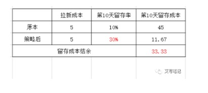第X天留存率成本计算公式:拉新成本 / 第X天留存率 - 拉新成本