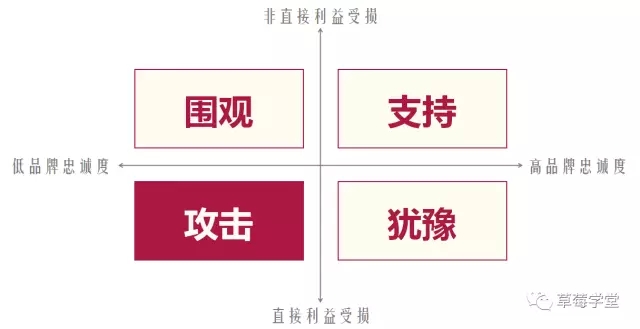 一般来说,根据品牌忠诚度高低,是否有直接利益受损,品牌危机中吃瓜群众对品牌的态度大致可分为四类: