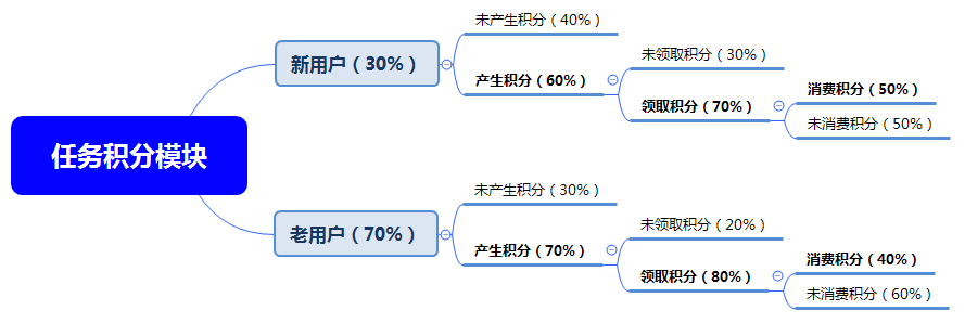 在任务积分模块中,首先整理新老用户进入模块数据,再看用户是否通过做对应的任务是否产生了积分,接着看产生了积分的用户是否领取了积分,最后看领取了积分的用户是否产生了消费。