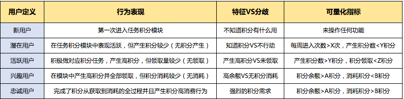 在任务积分模块中,根据不同用户层的特征提炼,定义用户层级,可以整理成这样一个表: