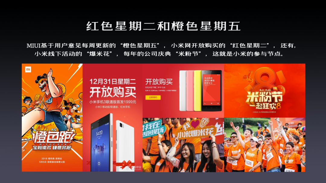 其他案例:企业造节,比如双11、京东618、特步321跑步节、淘宝购物节、小米红色星期二/橙色星期五、小米米粉节等。