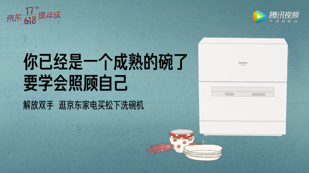 一般的洗碗机广告都是以人为主角,从人的角度出发做创意,而京东家电这支广告却让盘子成为主角,盘子相互搓澡,自己照顾自己,从而将松下洗碗机能让我们解放双手的利益点带了出来,可谓妙哉!