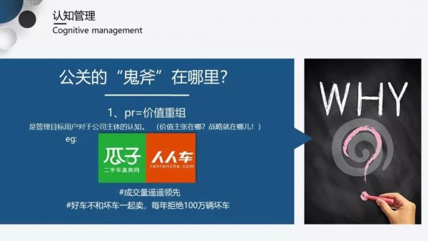接下来,我和大家分享两个有趣的案例。第一个是 2017 年时,瓜子二手车和人人车一个比较经典的公关案,当时瓜子二手车抢占了 60% 的市场份额,它当时输出的战略是:成交量遥遥领先。而人人车暂时处于第二梯队,于是它思考如何通过新战略和价值的重塑突破到第一梯队。而这个行业当时的冲突点是,买家不希望花钱买到坏车,而卖家不希望好车卖出一个坏价格,所以人人车当时提出的新战略是:好车不和坏车一起卖,每年拒绝 100 万辆坏车,到了 2017 年下半年,它们的份额已经超过了瓜子二手车,大家可以在这其中看出 PR 在价值重组中的重要性。