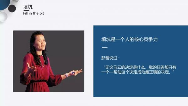 大家看到的这位,是我非常欣赏的职场女性–彭蕾。当她卸任阿里巴巴集团职位的时候说过这样一句话:“无论马云的决定是什么,我的任务都只有一个–帮助这个决定成为最正确的决定。”当时的演讲对我触动很大,对于公关人而言,填坑能力也非常重要,你能填多大的坑就意味着你的进阶性有多强。当老板天马行空的时候,你要把这个坑填的非常好。