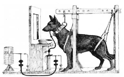 巴甫洛夫是前苏联的一位知名心理学家,也是高级神经活动生理学的泰斗。他在这个实验中,先把狗狗固定住,并用一根管道收集它吃食物时分泌的唾液,这时侯“唾液”的产生是由生理的自然条件决定。