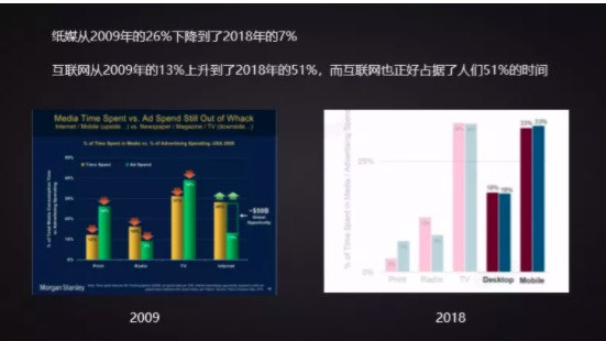 我们直接对比2009年到2018年的数据,纸媒从09年的26%下降到18年的7%,而互联网从09年的13%上升到18年的51%,而互联网也正好占据人们51%的时间。