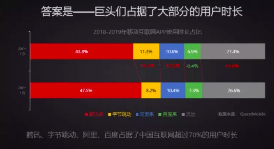 当然是巨头们占据大部分的用户时长,从课程的图片中我们可以看到——腾讯、字节跳动、阿里、百度占据中国互联网超过70%的用户时长。