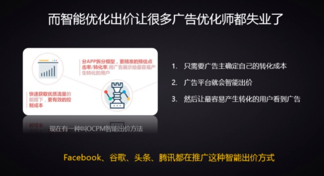 而且智能优化出价让很多广告优化师都失业,只要广告组确定自己的转化成本广告,平台就会自动智能的出价,然后让最容易产生转化的用户看到我们的广告。今天Facebook、谷歌和腾讯都在推广这种智能的出价方式,