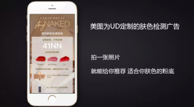 我们看到课程中的这张图,这是美图为ud定制的一个肤色检测广告,拍一张照片就能给你推荐适合你肤色的粉底,他把广告和功能进行一个深度的结合,让用户在功能中就能体会品牌的内涵,这也是一种意图原生的广告,