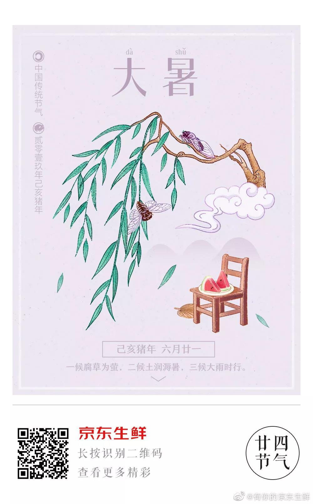 今日#大暑# ,二十四节气中的第12个节气,夏季的第6个节气,大暑“三伏天”是我国一年中日照最多、气温最高的时期,这段时间要多吃荷叶、莲子、冬瓜、扁豆、薏仁等祛湿食物,适当吃点苦瓜、苦菜等苦味食物,都具有很好的清热解暑、健脾开胃的作用。#天猫24节气图#