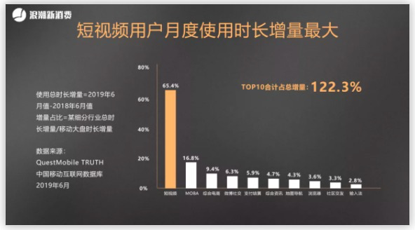 这是2019年6月份和2018年6月份的对比,我们看到短视频的增长量达到了65.4%,远远超过了后面的游戏、电商。