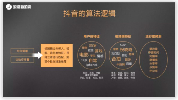 所以抖音它知道每一个用户的基本特征,同时又知道每一个视频的特征,而且还能够判断出这条视频的流行度到底怎么样。从这样的逻辑上去推荐内容,就得到了千人千面的抖音。