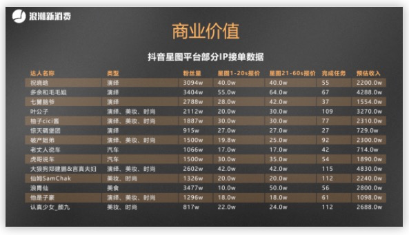 这是抖音部分IP的公开数据,你看这些IP的类型会发现,跟我们刚才看的最受用户欢迎的视频类型基本是一致的。所以平台趋势和商业价值是我们在赛道选择上要做的参考。