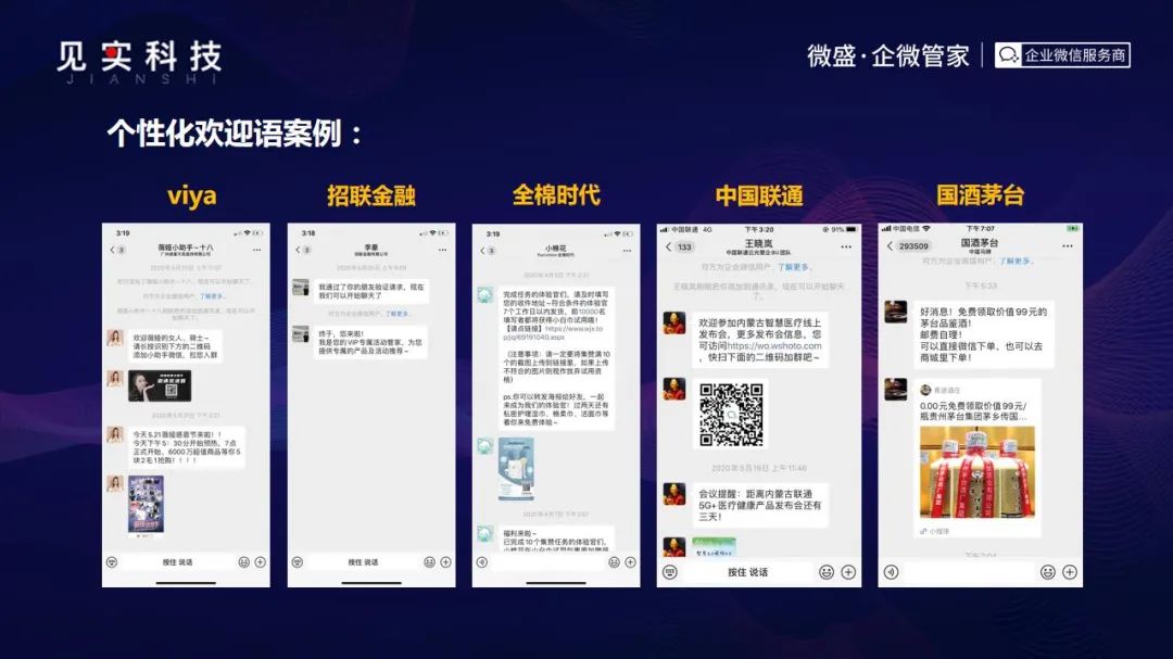 像薇娅、招联金融、中国联通、茅台等都在使用企微管家的个性化欢迎语功能,来给客户提供有温度的服务。