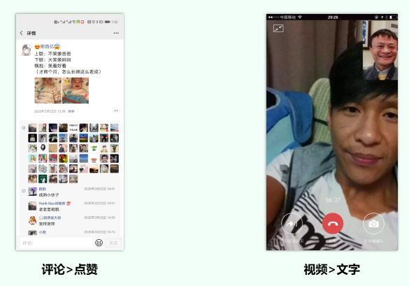 而在互动强度上,评论是大于点赞的,视频是大于文字的。所以如果两个并不是很熟的用户要产生互动,从点赞开始会比较容易成功;文字交流也比视频沟通来的轻松。