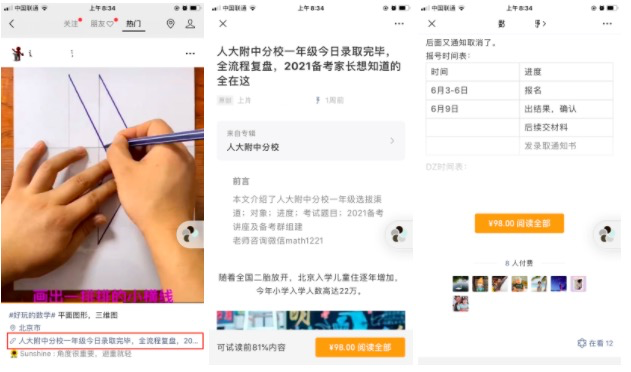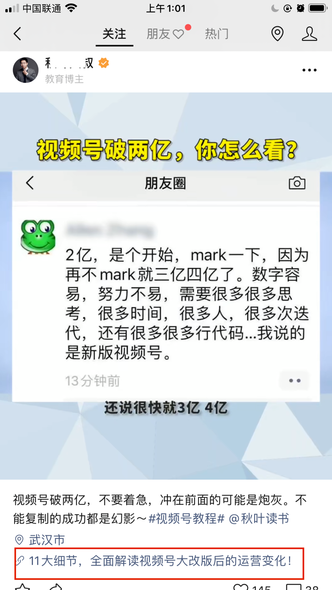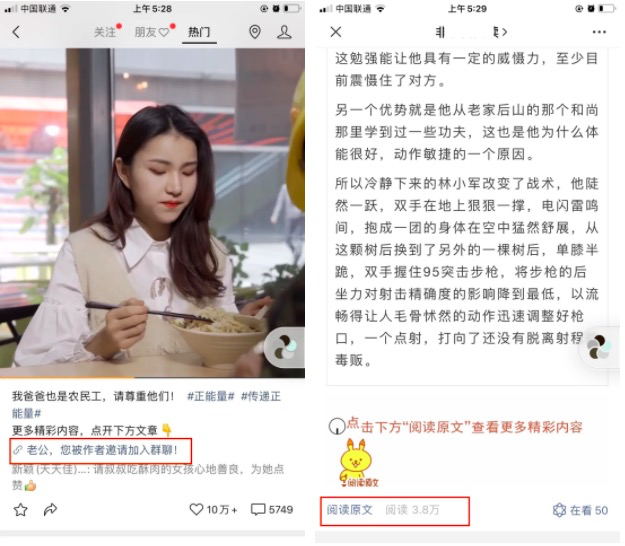 热门中,经常刷到点赞爆棚的视频,附上一个公众号,公众号中“阅读原文”引导付费阅读。