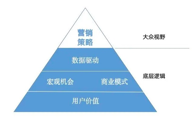 用户增长的全局视野包括:用户价值、宏观机会、商业模式、数据驱动和营销策略,其中营销策略是冰山顶端,也是唯一被大众视野直接看到部分。