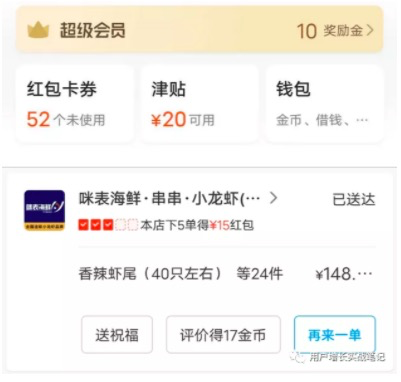 同样是商品促销,最后举一个反例:饿了么的超级会员体系针对让用户多下单,有多种策略同时进行(如图11)。首先,购买超级会员之后,可以定期获得购物津贴,每个月20元的津贴,主要可以用来在津贴联盟中消费,并可以叠加红包使用,津贴有有效期,会催促用户尽快使用;然后,会员拥有奖励金,用于兑换通用的红包,消费或额外完成一些任务可以获得奖励金;最后是会员专享的一些折扣红包,每个月可以领4个。总之,成为会员之后,在App内感觉到的是处处都有优惠,有在某些店固定消费习惯的顾客,还可以领取“满X笔获得Y元”的店铺红包。作为饿了么的老用户,我确实能够用到这些促销券,并且使用后优惠力度确实很大。但是如此多的概念,是对普通用户实在是极不友好:有商家满减、津贴、会员红包、店铺任务红包等,有些能够共用,有些则相互排斥。别忘记了,这些促销的策略是提升购买转化。如果没有其他限制条件,需要尽可能简单直接告知用户“最多可用多少优惠”。