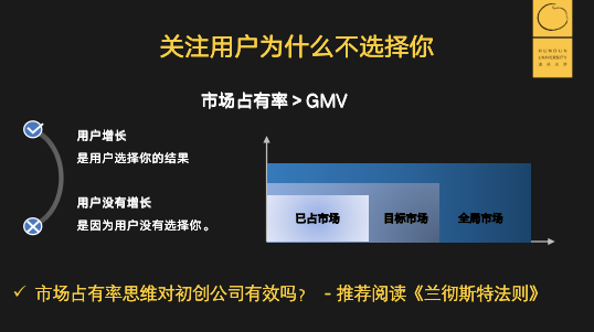 GMV关注的是已经发生在平台上的交易总量。而市场占有率关注的是目标市场里还有多少人没有使用你。