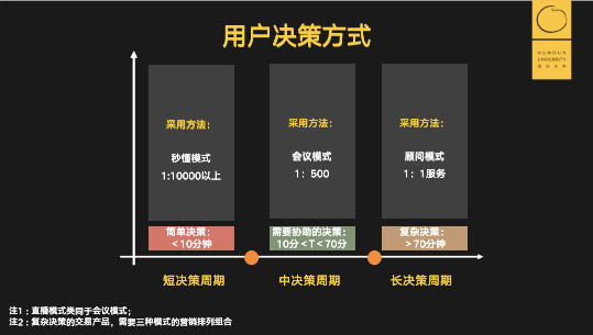 第三类:中周期决策产品。其营销方法提炼为“会议模式”,需要10-70分钟的时间跟用户进行深度沟通。