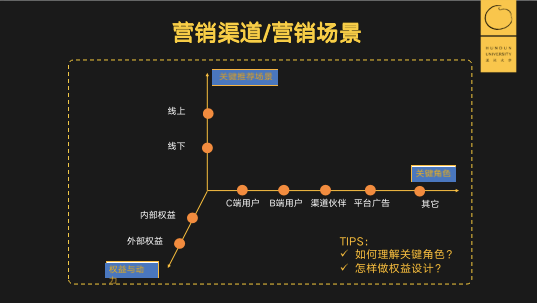 纵坐标为场景,可分为线上场景和线下场景。C端和B端用户经常会用到私域流量,这些私域流量如果放在线上是微信群和朋友圈带来的社交流量。如果在线下则是用户口口相传带来的口碑流量。