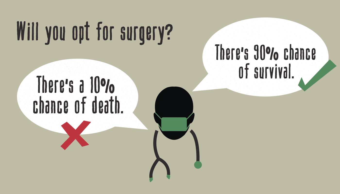 我们倾向于在做决策时关注积极的事情。如果医生要建议你做一个手术,并告诉你手术有10%的死亡几率,你肯定不想再接受手术了。但如果他告诉你手术有90%的几率让你痊愈,你就非常乐意接受手术。