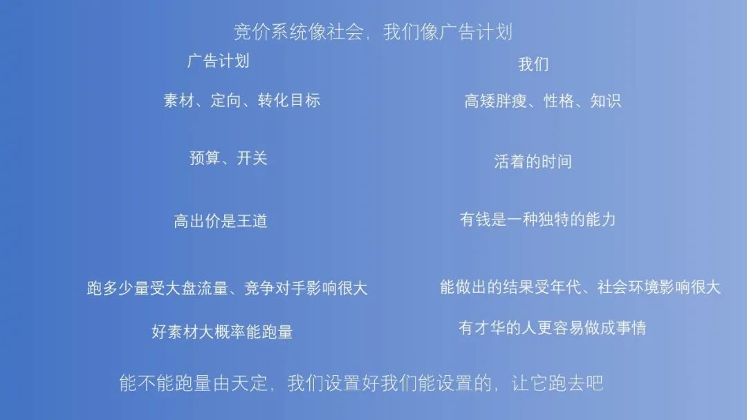 把广告系统理解成我们生活的社会,把我们理解成广告计划,投放的很多现象都会好理解一些。