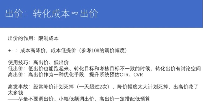 接下来我们再往下看,出价的作用很简单了,就是限制成本,它使用的基本思路也是这样的,成本高的话就降价,成本低的话就提价。出价是控制成本最直接有效的手段,我们说定向也能够对于成本有影响、素材对于成本也会有影响,但是它们都不够直接,最直接的肯定还是出价。