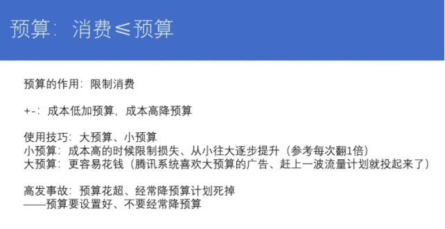 这个是我特别想说一下的,因为我觉得在我接触到的媒体的培训资料里,对于预算、出价和开关的设置方法、使用技巧,是介绍的相对比较少的,但是其实在调账户的时候,尤其在我自己带新人的时候,我会特别希望告诉他预算、出价和开关这几个东西要怎么调,因为它是调帐户比较主要的、或者说就是决定性的因素。