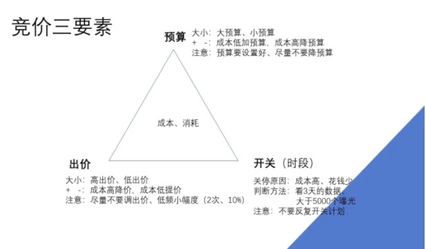 无论是对于新人,还是对于有一定经验的优化师,预算、出价和开关都是投放的时候比较关键的三个因素,我们管它叫“竞价三要素”。