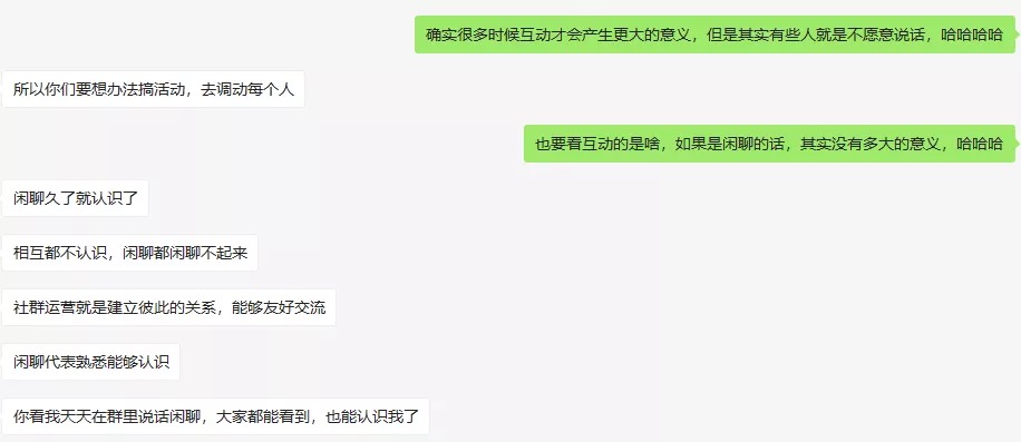 无可否认,如果大家在群里多发言,多说话,大家之间的链接会加深一些,但是为了发言而最终变成了一个聊天群,这真的是社群创立者愿意看到的吗?