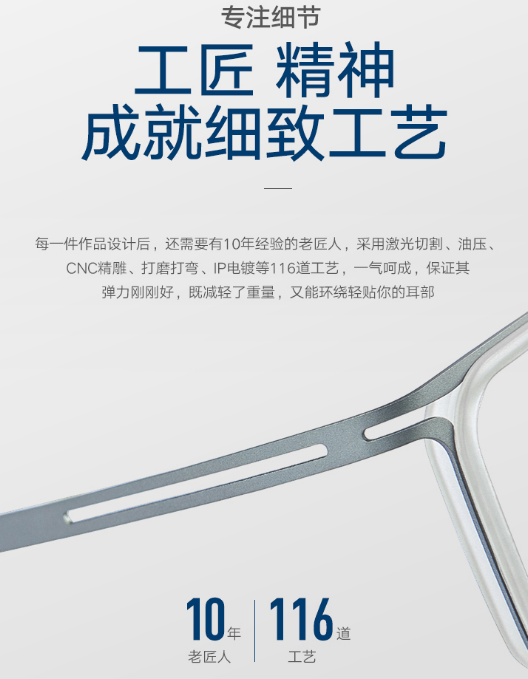 人人都能听懂的大白话,让人能身临其境地感受到“轻”,想象“轻”眼镜戴起来会更舒服,从而有兴趣继续往下看,了解产品的其他特点。