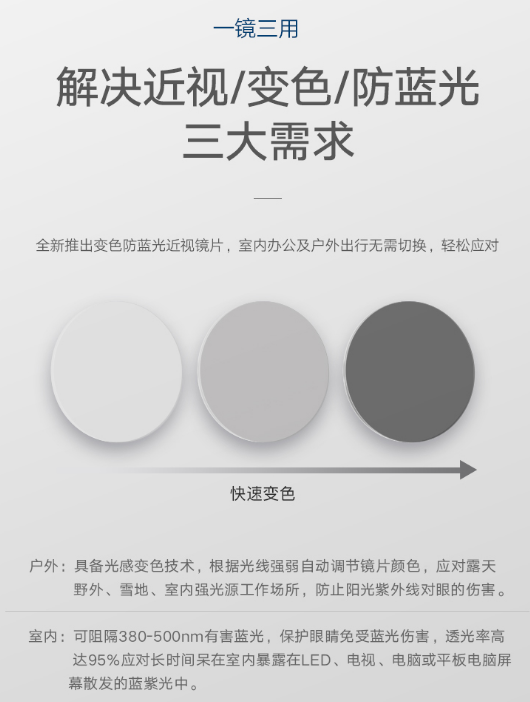 除了美观外,又接着强调镜片的用处,一镜三用,解决了近视眼者所担心的问题,也充分给了消费者购买的理由。