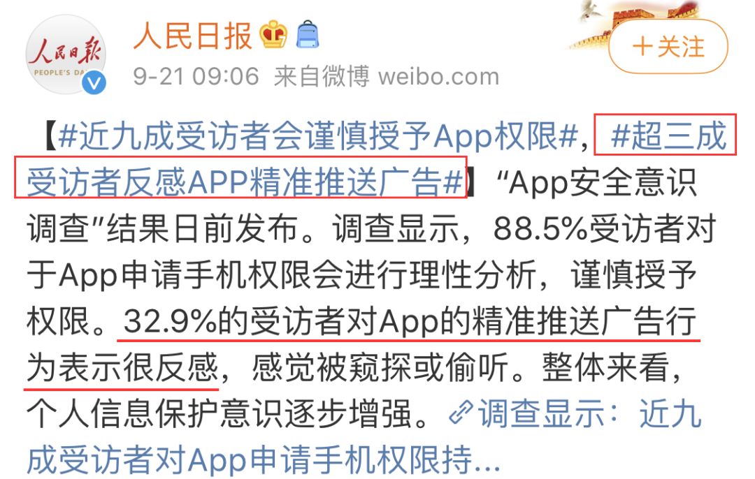 昨天,人民日报推出#超三层受访者反感App精准推送广告#,不少网友表示「不授权就不让使用,完全是捆绑销售,毫无隐私可言」「广告无孔不入」,在营销人看来网友热议的背后,一是对捆绑销售和窥探隐私的厌恶,二是对随处可见的广告内容疲倦了。