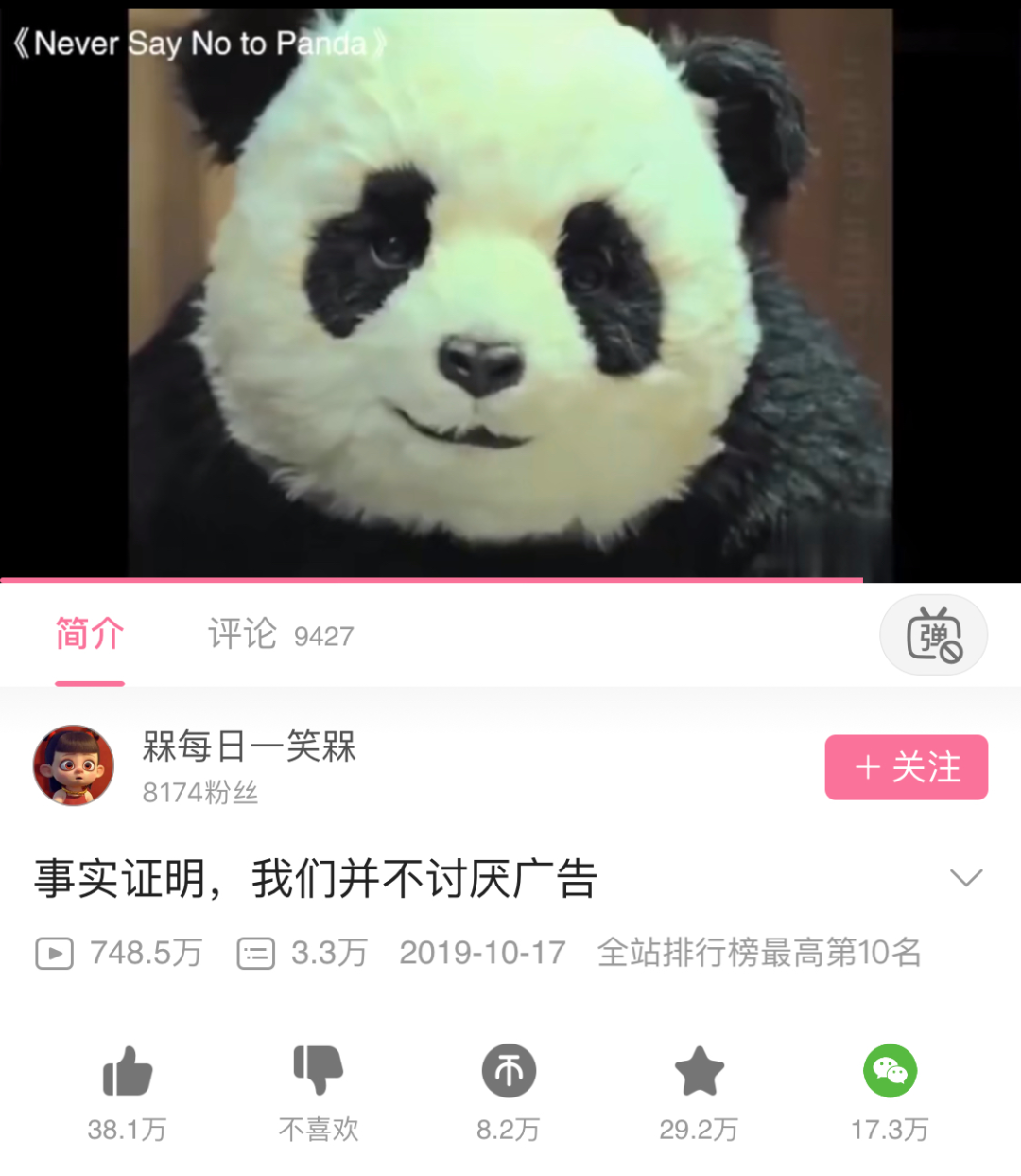 UP主槑每日一笑槑发布了创意广告《Never Say No to Panda》,并表示:事实证明,我们不讨厌广告。并获得了700万+播放,3.3亿讨论,其中选择收藏的有近30万。纵观内容极具创意,在神转折之间每一个结果都在意料之外。