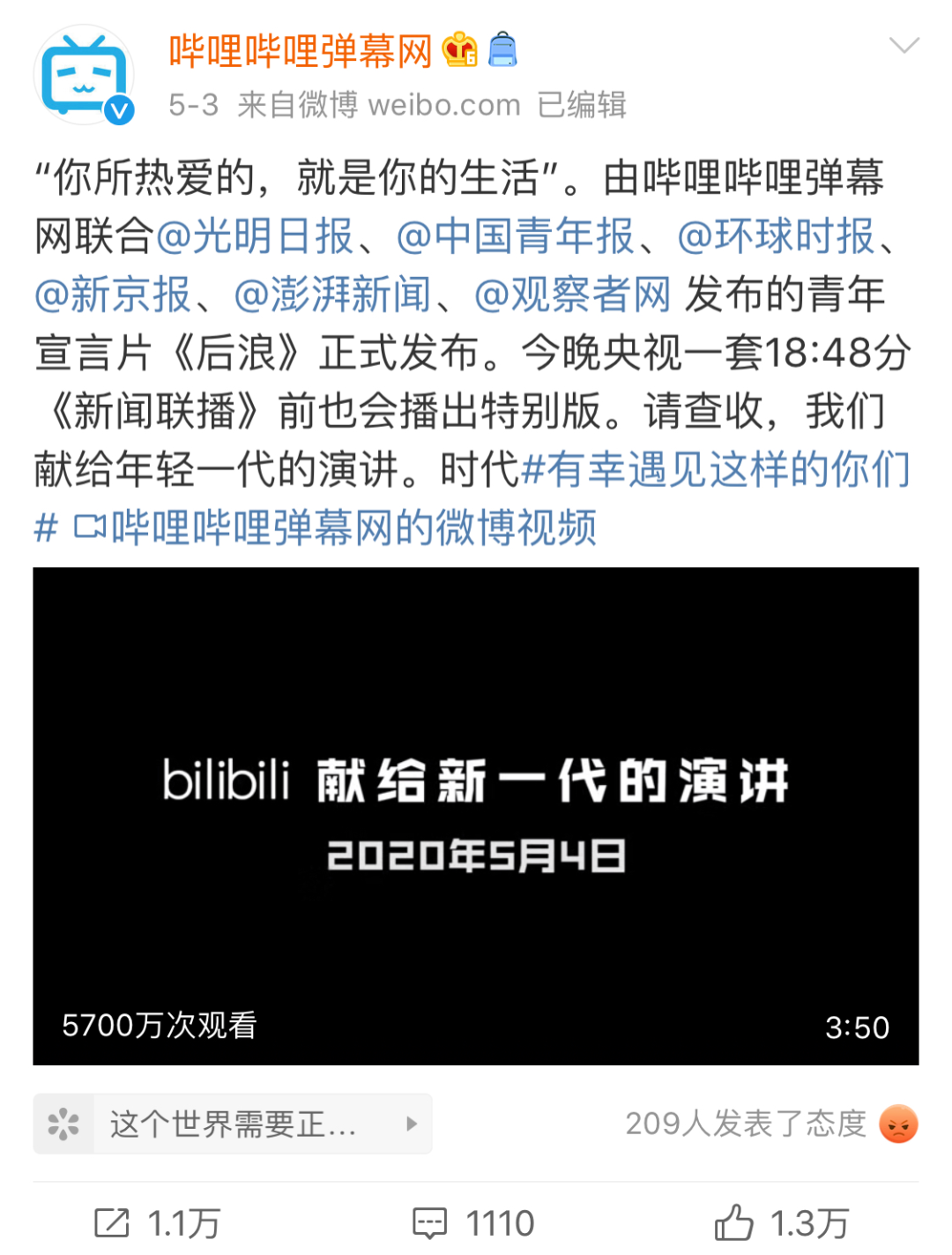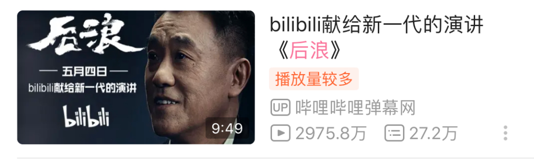 今年五四青年节期间,B站推出了广告《后浪》被网友称之为现象级内容,一经推出,就呈现了刷屏的现象,仅仅在B站的播放量就接近3000万,评论27.2万。在微博上,官方账号的广告视频播放超过5700万。