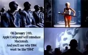 这段播放在第18届“超级碗”间隙的60秒广告,巧妙化用了小说家乔治·奥威尔的同名神作《1984》,呈现了一个反乌托邦式的故事。一支队伍伴随着毛骨悚然的音乐整齐前行,渲染了极度压抑的绝望氛围,女主是意图毁灭思想控制者的反叛人士,面对身后追捕她的独裁者爪牙,女主抡锤砸碎屏幕,一阵光芒中,苹果宣布推出新电脑Macintosh,并出现广告语:你将会明白,为什么1984不会成为《1984》。"直接叫板IBM。