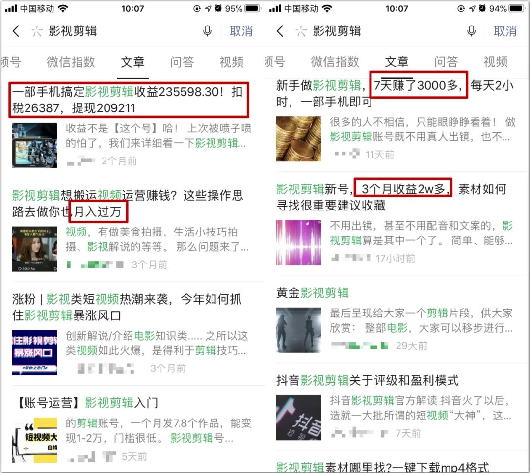 果酱妹随便搜索了一下影视剪辑的关键字,教程标题显示的收益分分钟上万。现在转行还来得及吗?(bushi)