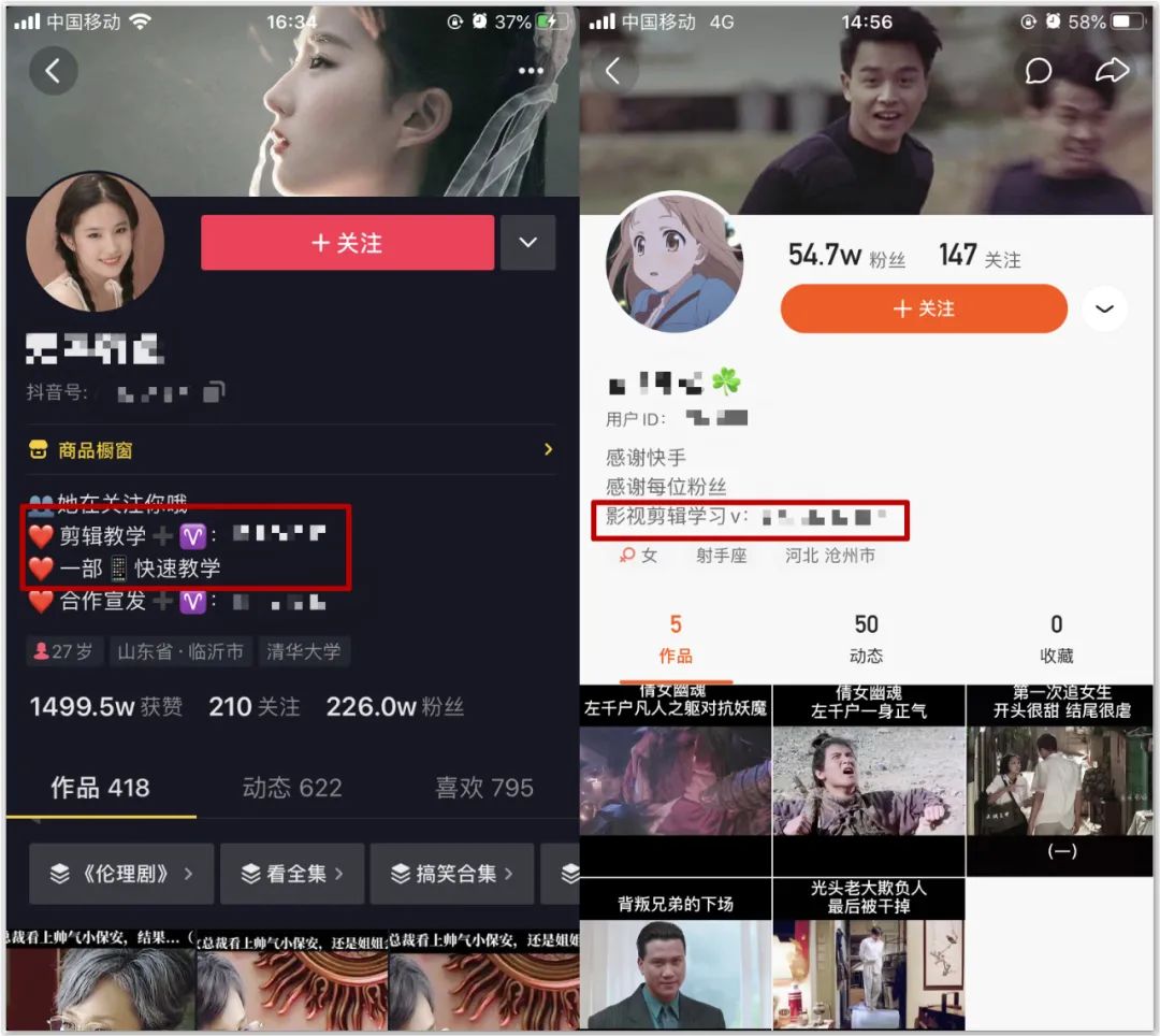 各大平台都有影视号博主在个人主页留下联系方式,把用户引流到微信或公众号上。