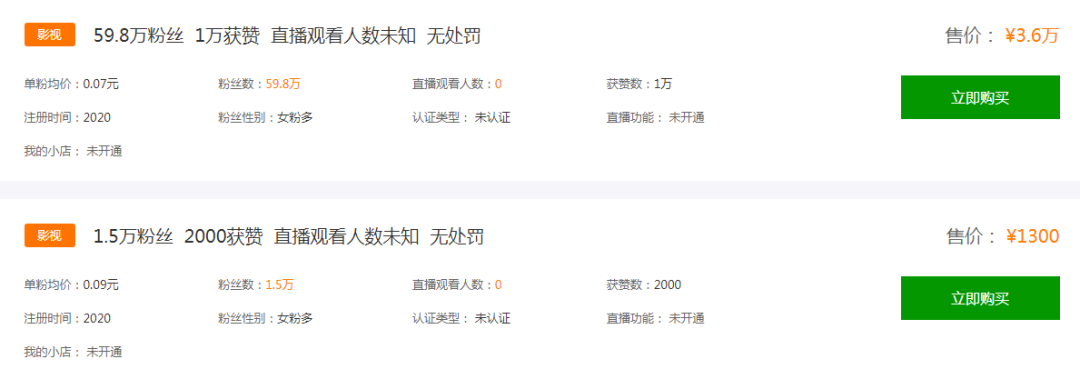 目前也已经有十分成熟的卖号平台,标明粉丝、获赞等账号状况,而且明码标价。
