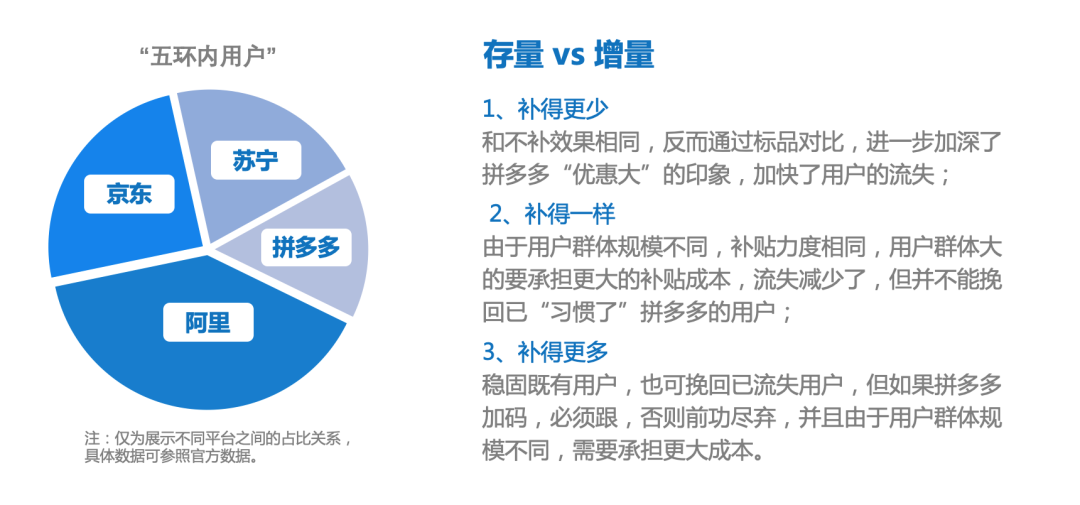 拼多多通过“百亿补贴”把阿里、京东拉入战局,迅速拉高了拼购类电商平台的获客成本,完成了对“五环内用户”和“五环外用户”的壁垒建立。