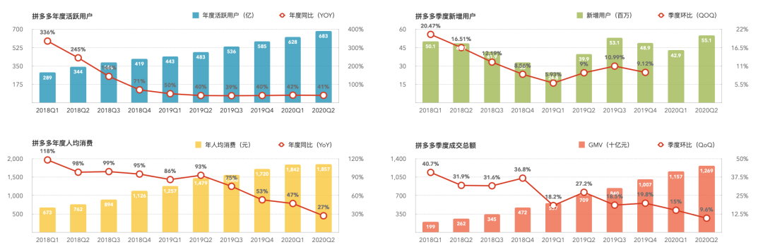 无论是“帮我砍一刀”的微信社交裂变,还是“C2M”对产业链的重构,拼多多从下沉市场开始,到通过“百亿补贴”的向上进攻,短短五年就实现了6.83 亿年活跃用户(拼多多 2020 年第二季度财报),超越京东的4.17 亿,紧随阿里7.42 亿,位于国内电商年活跃用户第二位。