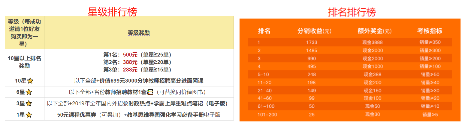 通常找到分销用户群后,我们还要对他们进行针对性地激励。并非所有的用户都会在意分销的佣金,很多时候课程权益才是真正爱学习用户最想要的,所以排行榜激励上可以把课程资料、实物、金钱搭配组合,来撬动不同用户圈层。