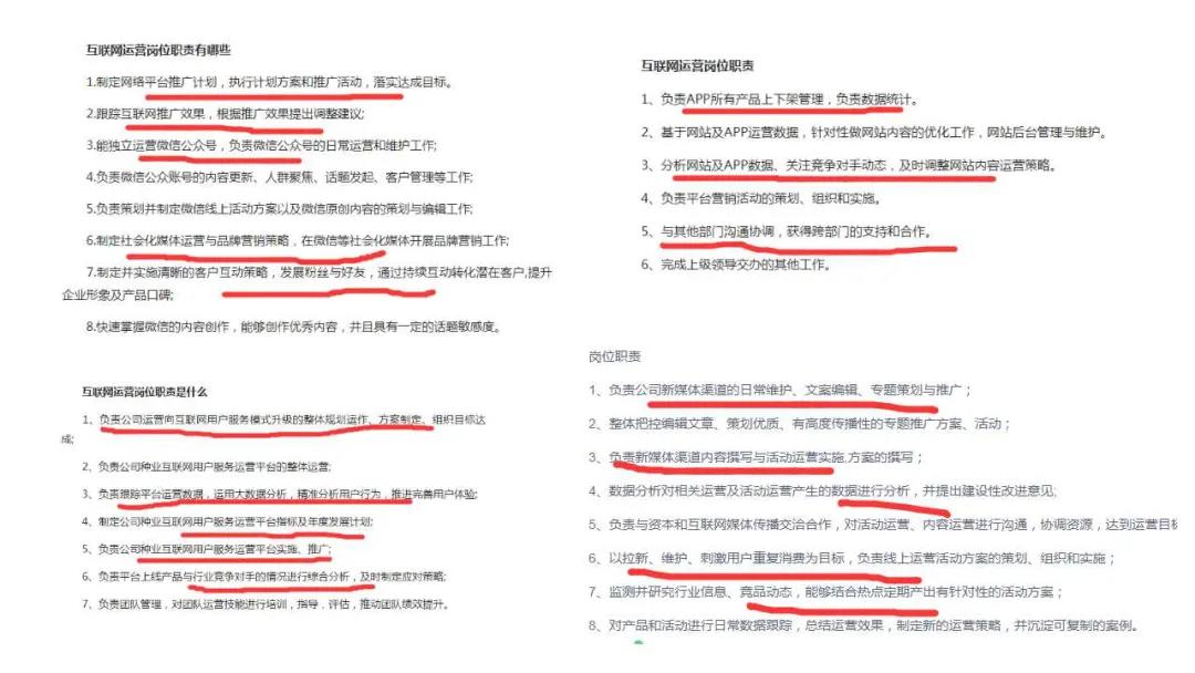 根据图片的内容我们不难看出,几乎所有的企业在招聘的时候都会要求这个运营的岗位要求做:新媒体运营(不限微博,头条,小红书,微信公众号),公司线上发展推广运营方案制定与执行;其他宣传文案的撰写,还有一些没有写到的APP,网站等运营管理;公司图片设计(我在找第二份工作时候面试就遇到过几次)等!