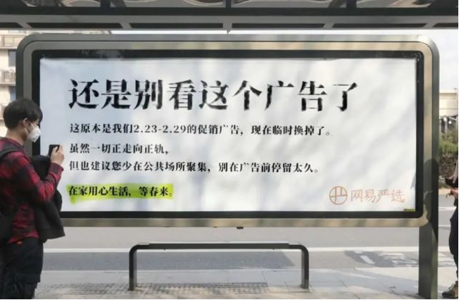 在这样的背景下,网易严选将原来的促销广告换成了公共场所的温馨提醒,广告牌上写着:“还是别看这个广告了, 这原本是我们2.23-2.29的促销广告, 现在临时换掉了。虽然一切正走向正轨, 但也建议您少在公共场合聚集, 别在广告前停留太久。”这波“反向操作”在此背景下成为亮点,博得了很多人的关注。