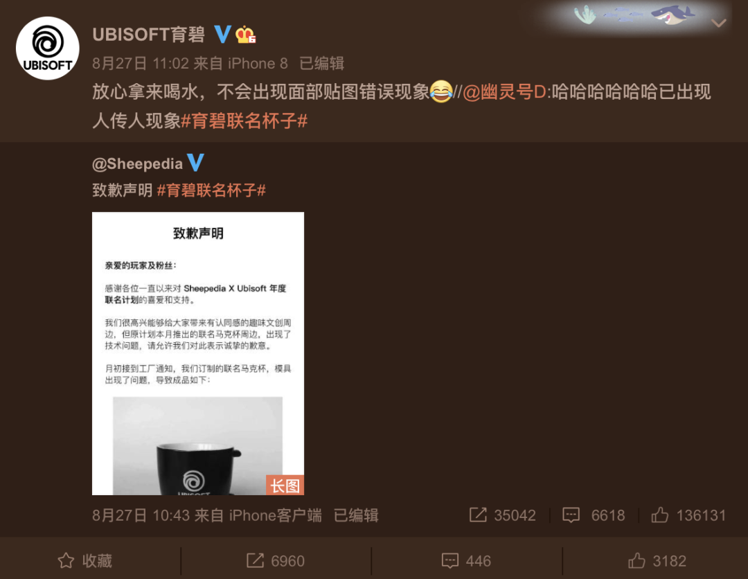 面对制作失误,道歉是必须的。官方声明:“一部分(杯子)留在公司内部供展示——时刻警醒我们面对工作要一丝不苟,减少错误的发生。”而另一部分,它决定择期面向公众赠送或销售(仅供收藏)。这个决定,体现出品牌有意以自身问题为宣传点去大胆公关。微博上,育碧告诉粉丝:“(杯子)放心拿来喝水,不会出现面部贴图错误现象”。