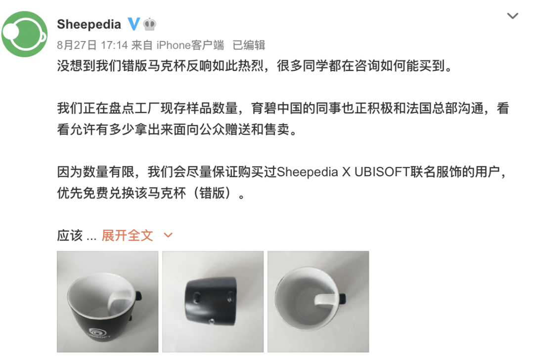 眼下,不少玩家将这款错版马克杯列入“2020年我最想要的没用产品之一”,表示:这才是拥有育碧特色、真正被玩家喜欢的周边。Sheepedia再次发声,对于粉丝们的热情,它承诺尽量保证购买过联名服饰的用户能优先获得这款马克杯。